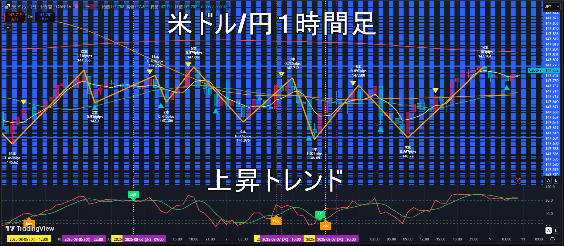 黄色の縦線でエントリー、紫の縦線で決済です。