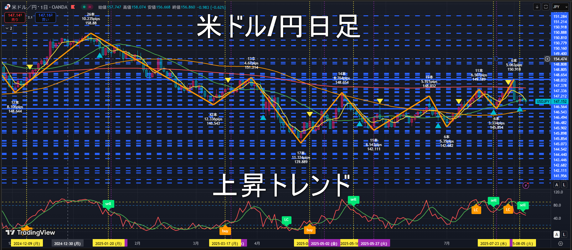 2つ前のピーク147.588円を上回ると実質上昇トレンドに転換。