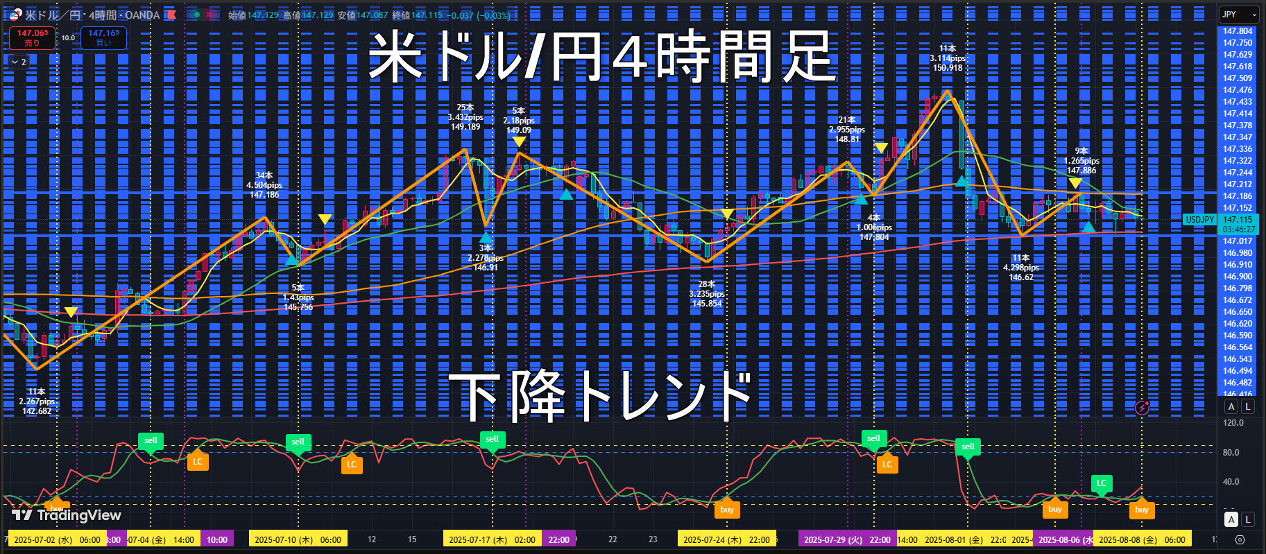 売りシグナルが出たローソク足以降で前のローソク足の安値を下回った147.356円で売りントリー