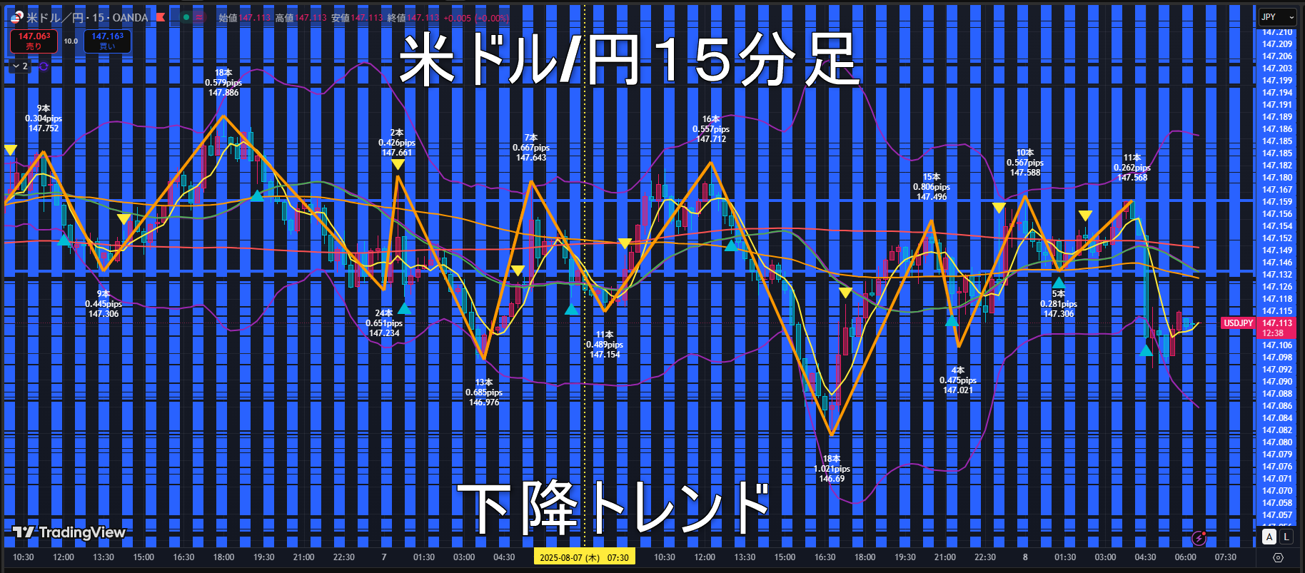 黄色の縦線でエントリー、紫の縦線で決済です。