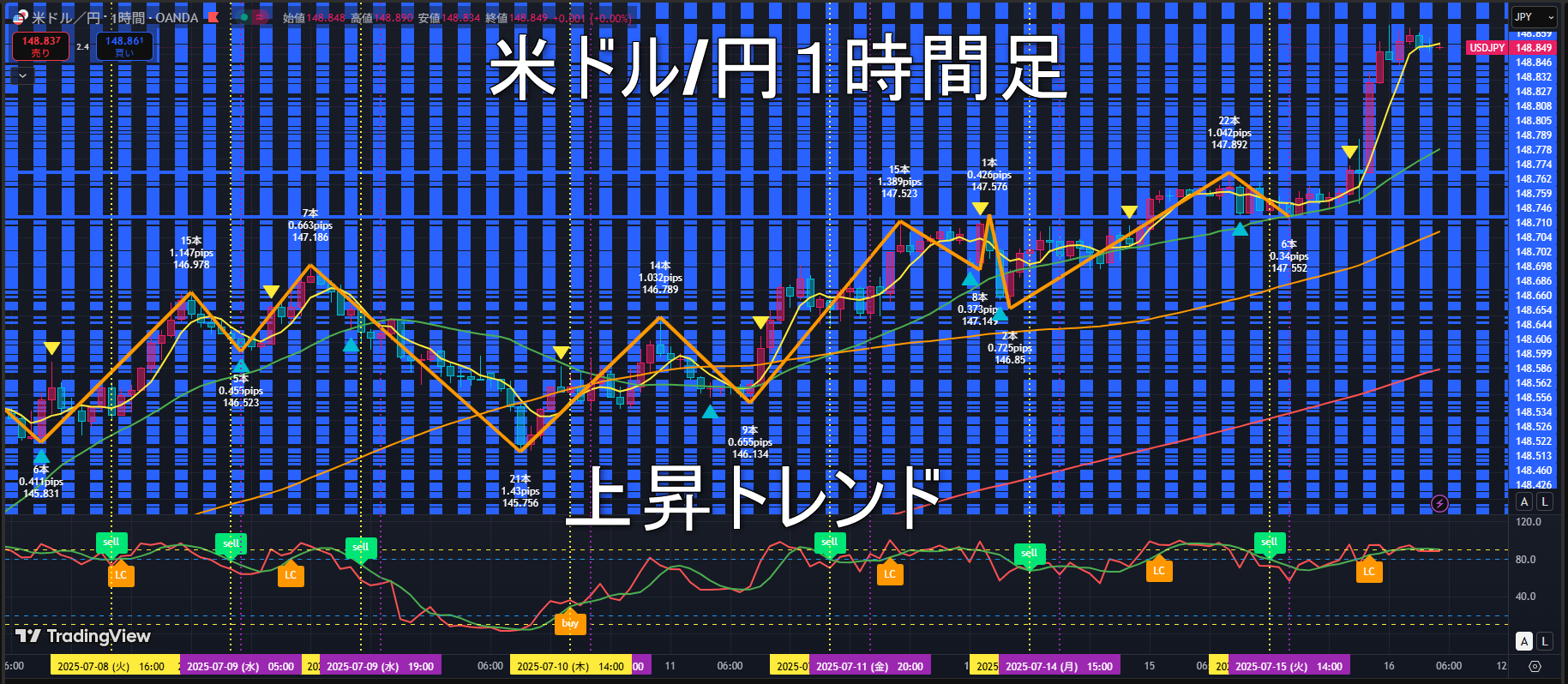 黄色の縦線でエントリー、紫の縦線で決済です。