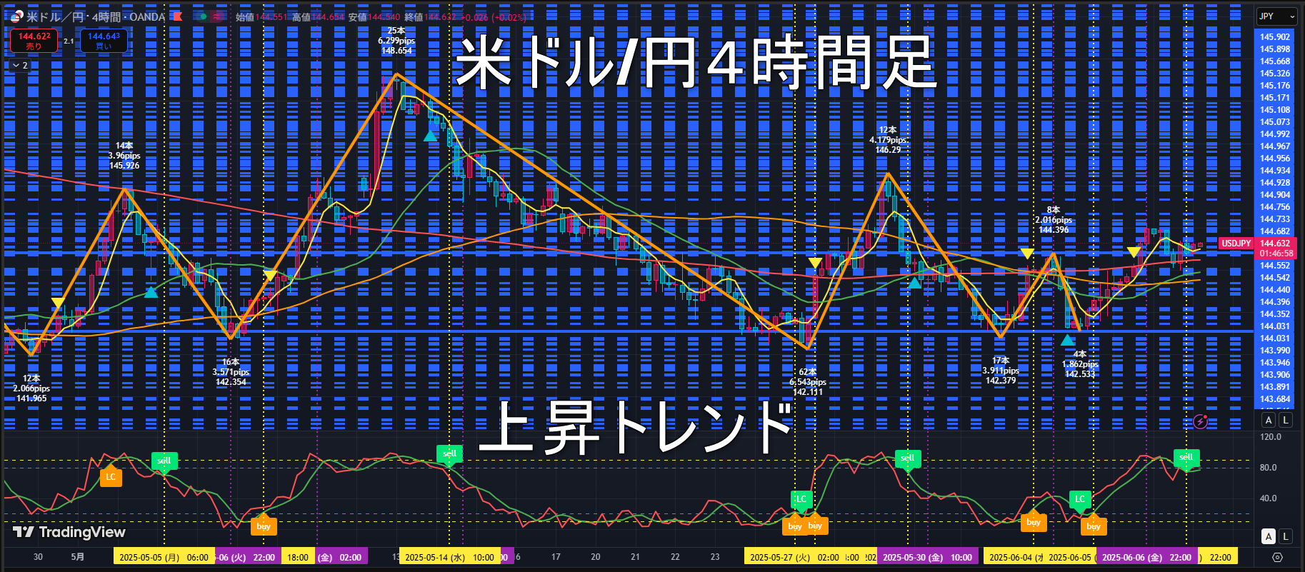 黄色の縦線でエントリー、紫の縦線で決済です。