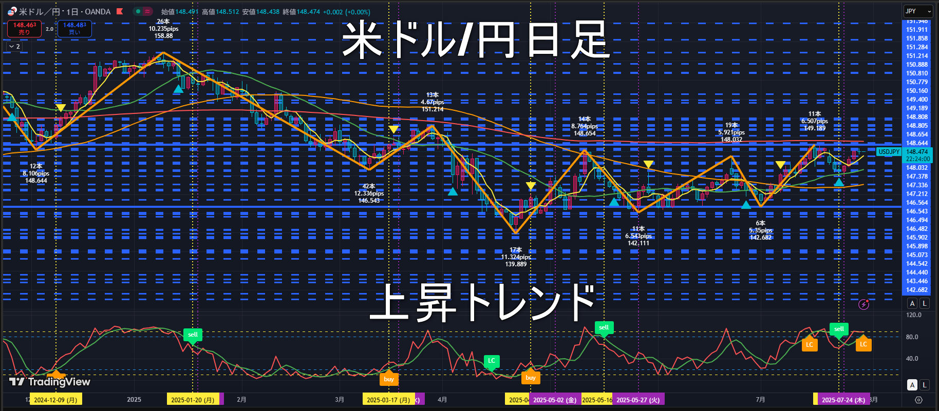 2つ前のボトム147.516円を下回ると実質下降トレンドに転換。