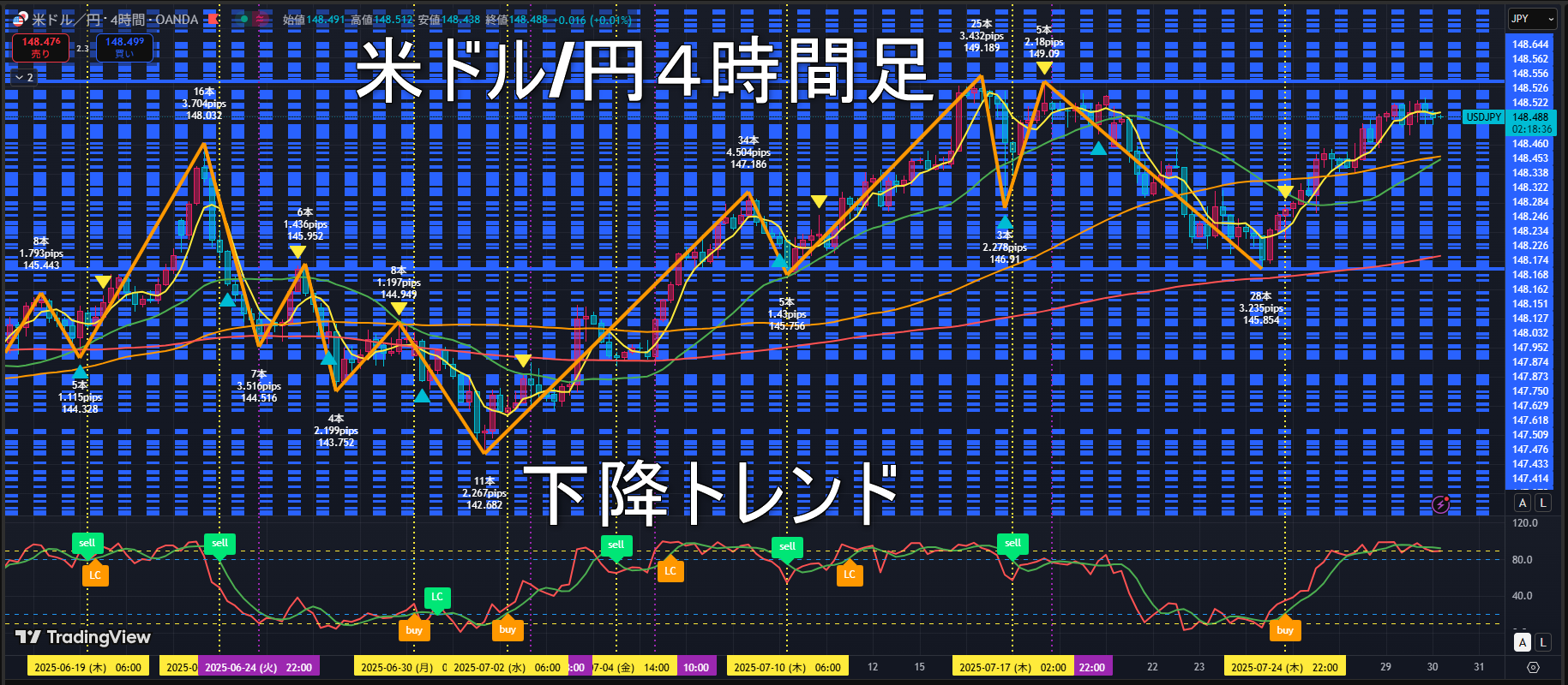 2つ前のボトム148.158円を下回ると実質下降トレンドに転換。