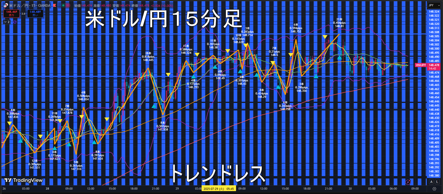 日足は上昇トレンド、4時間足は下降トレンド、1時間足は上昇トレンド、15分足はトレンドレス