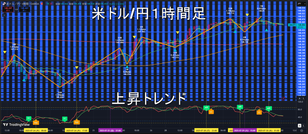 黄色の縦線でエントリー、紫の縦線で決済です。