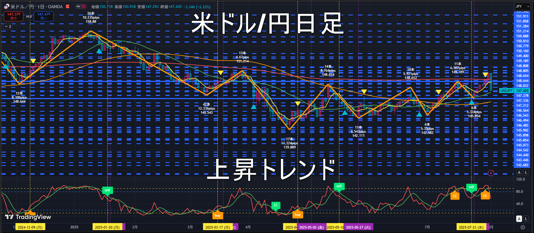 黄色の縦線でエントリー、紫の縦線で決済です。