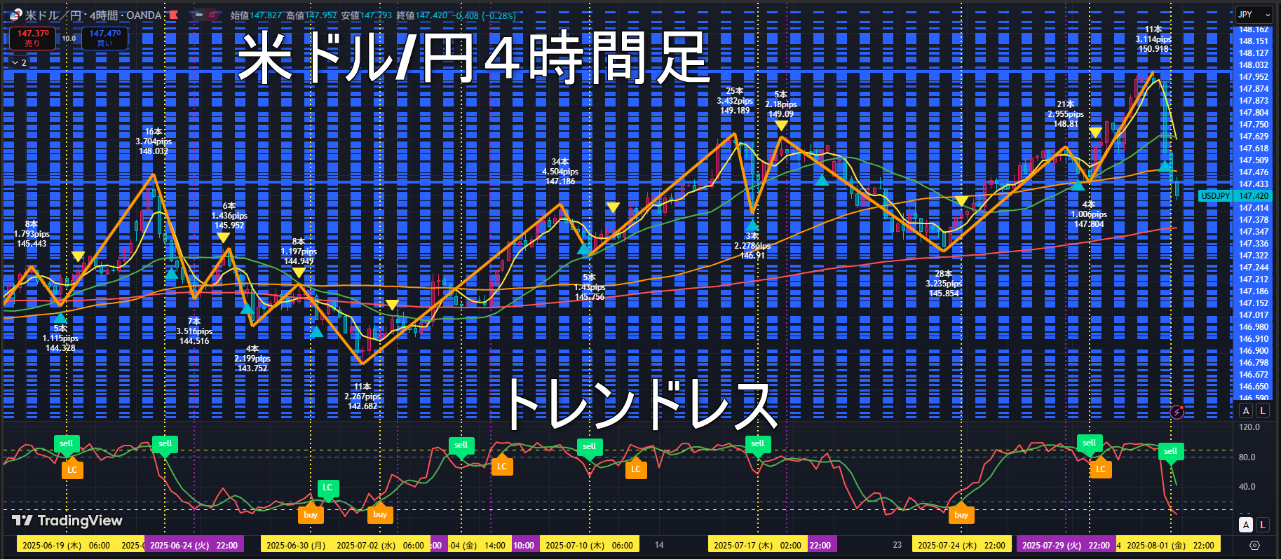 ②直近ボトム147.804円を上回るとトレンドレスに転換しますので様子見