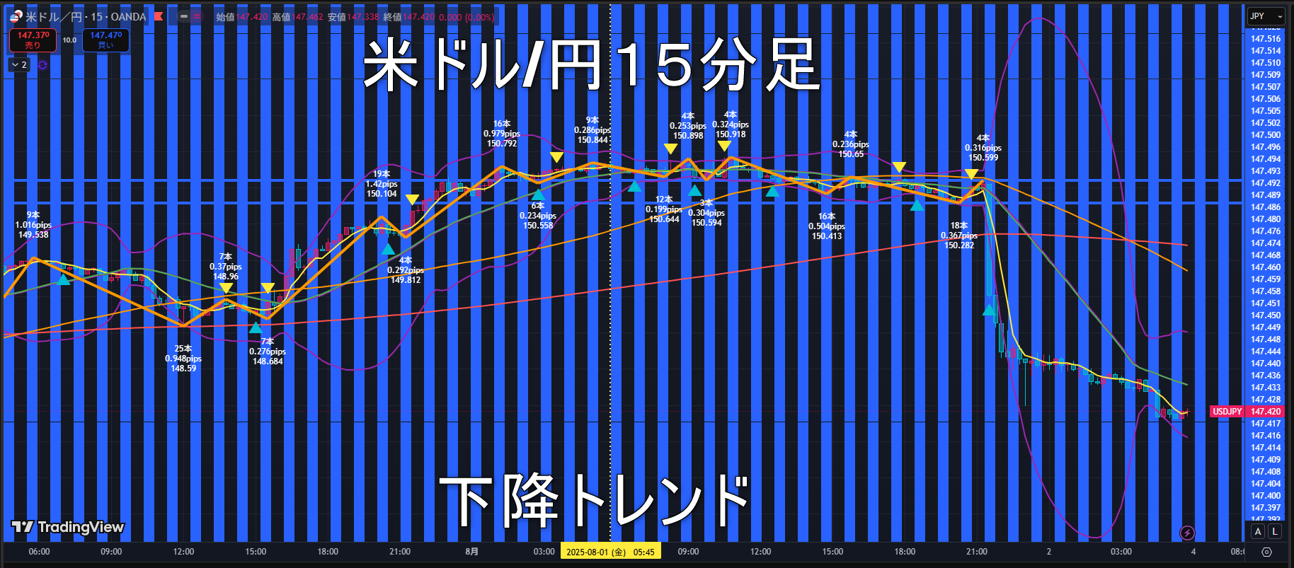 オリジナルインジケーターは8/1(金)19:00のローソク足で売りシグナルが出ました。