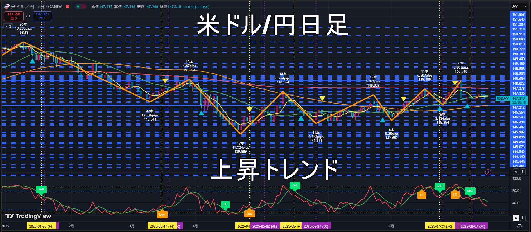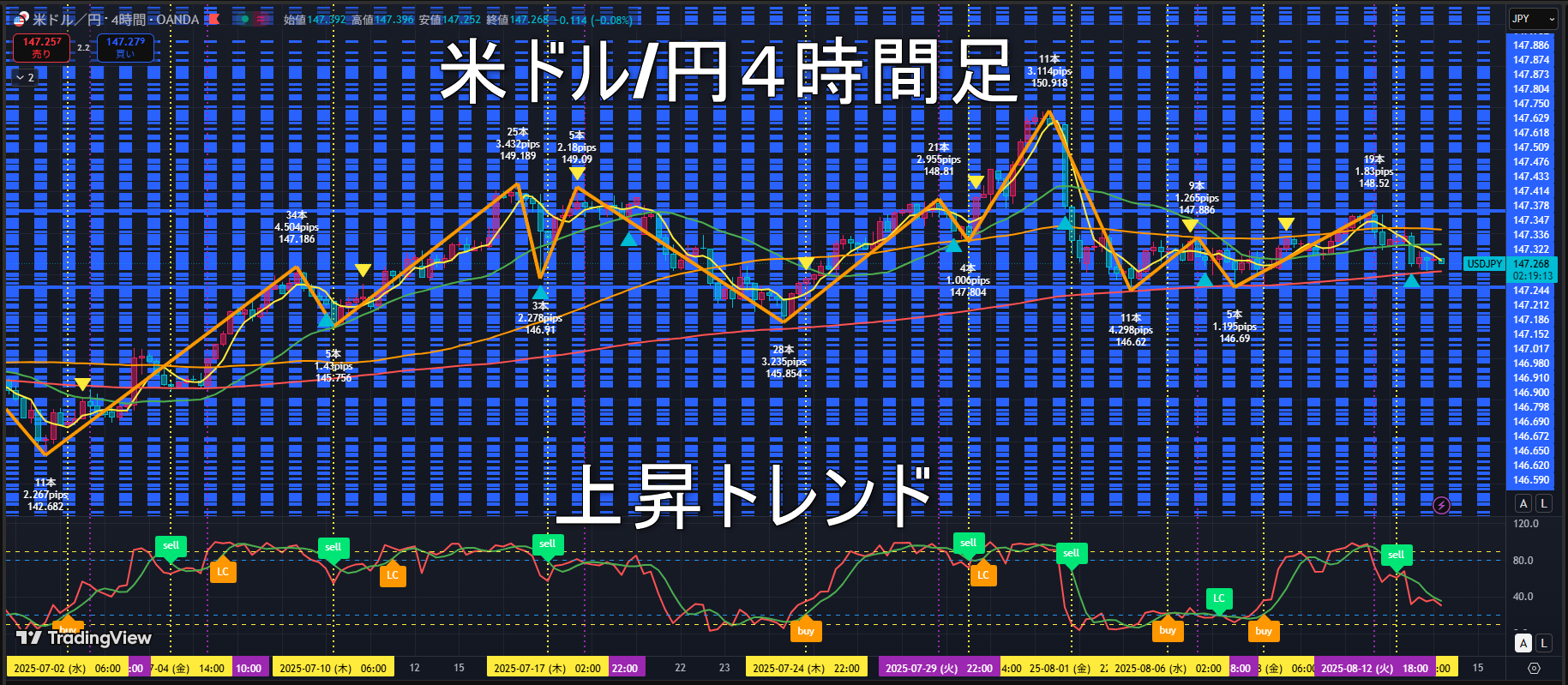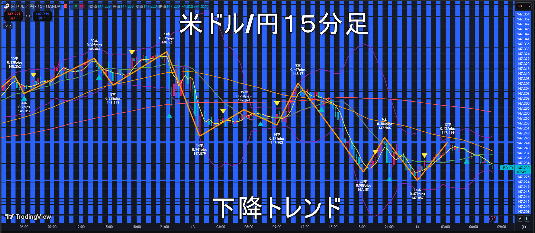 黄色の縦線でエントリー、紫の縦線で決済です。