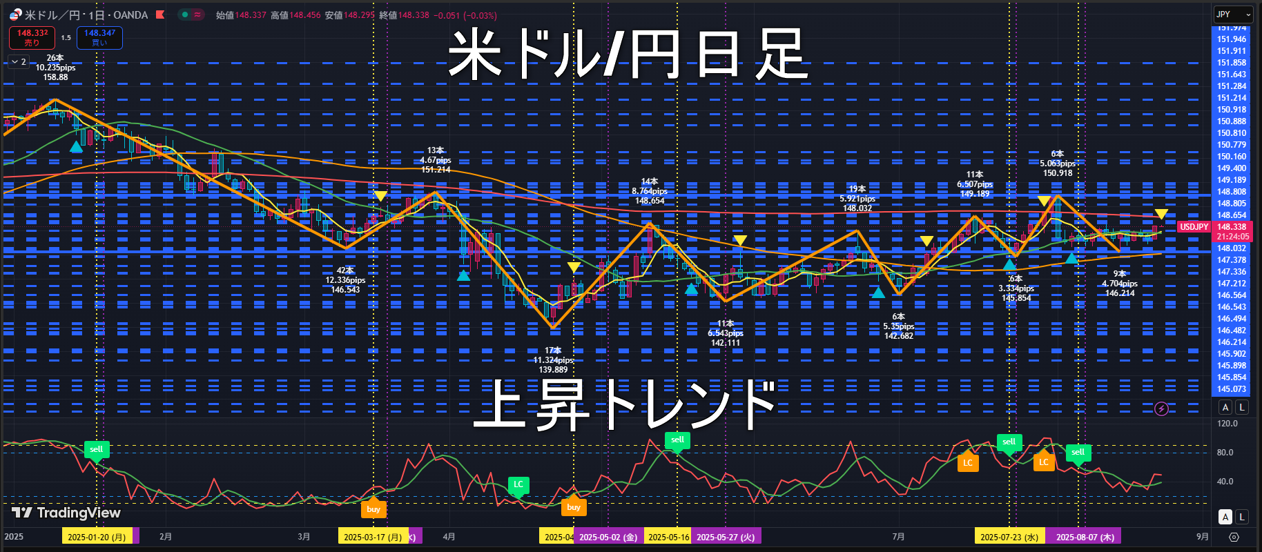 2つ前のピーク147.904円を上回ると実質上昇トレンドに転換しますので、上回った後、調整を待って支持線から再上昇開始の動きがでれば買い