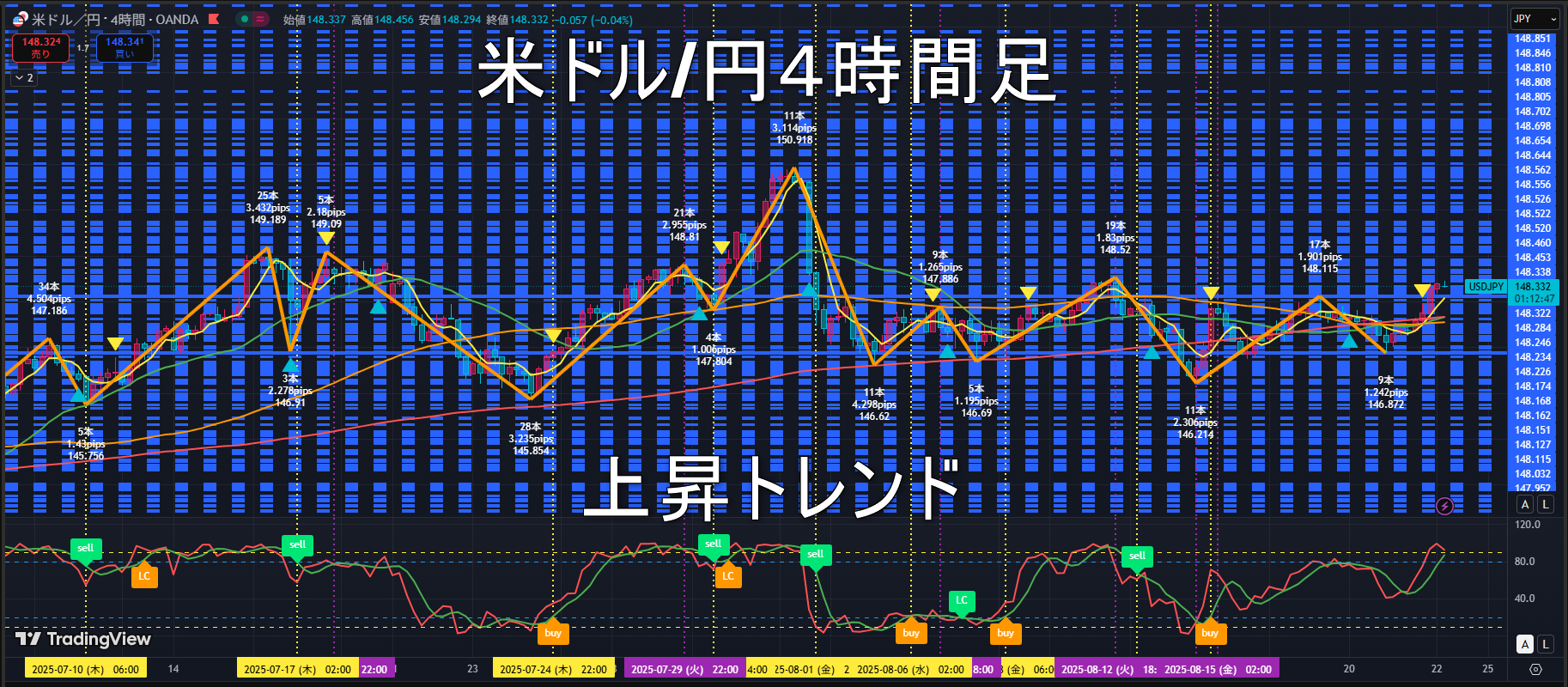 黄色の縦線でエントリー、紫の縦線で決済です。
