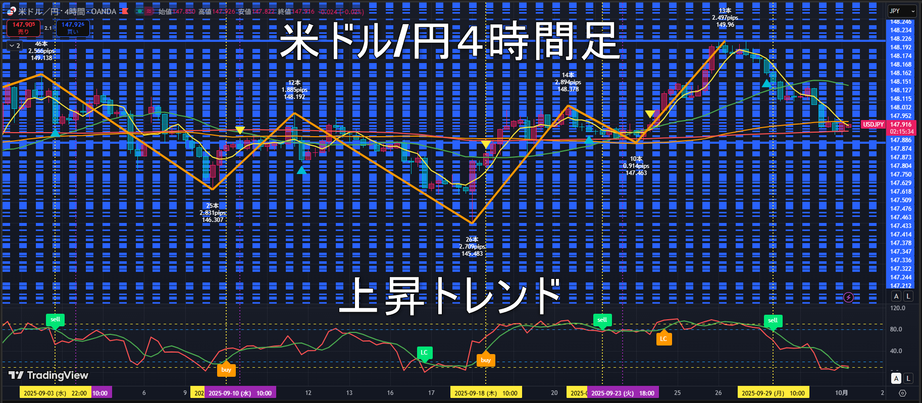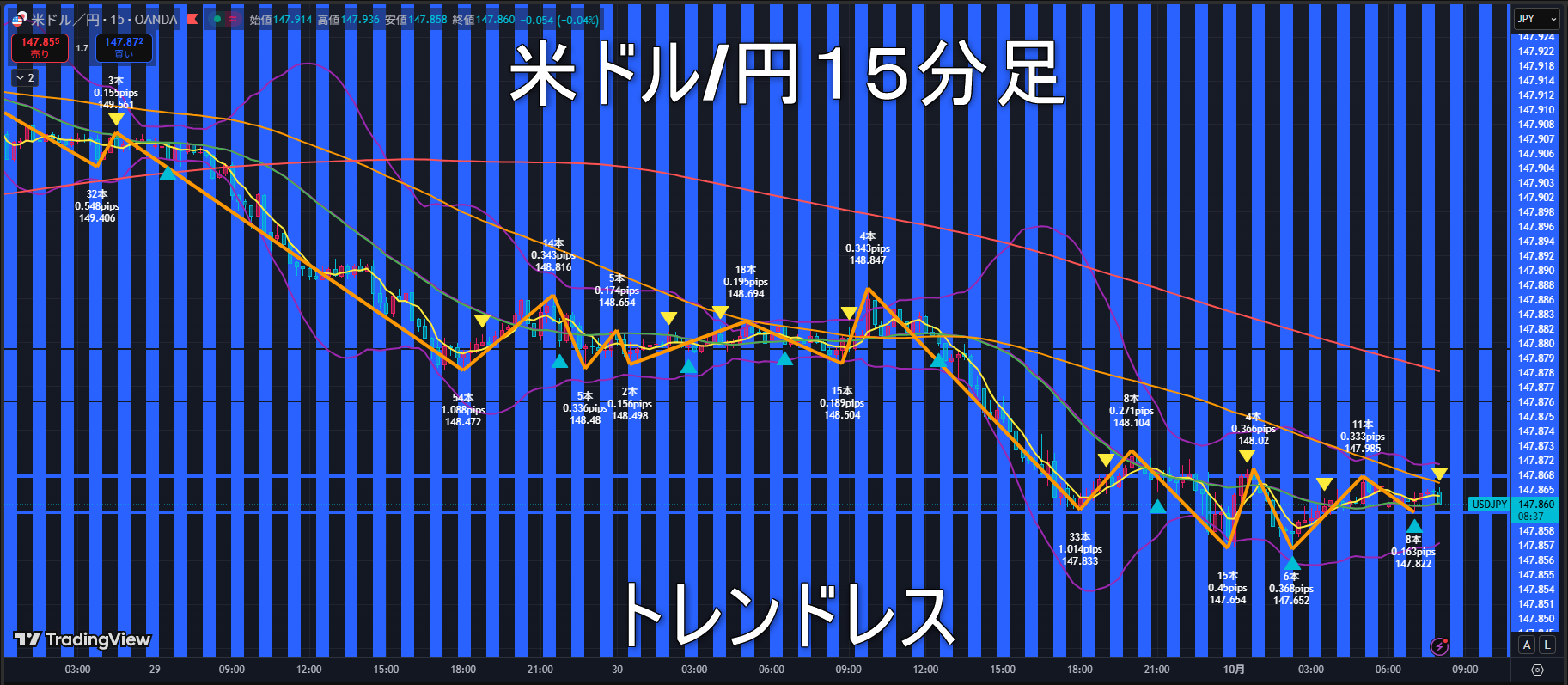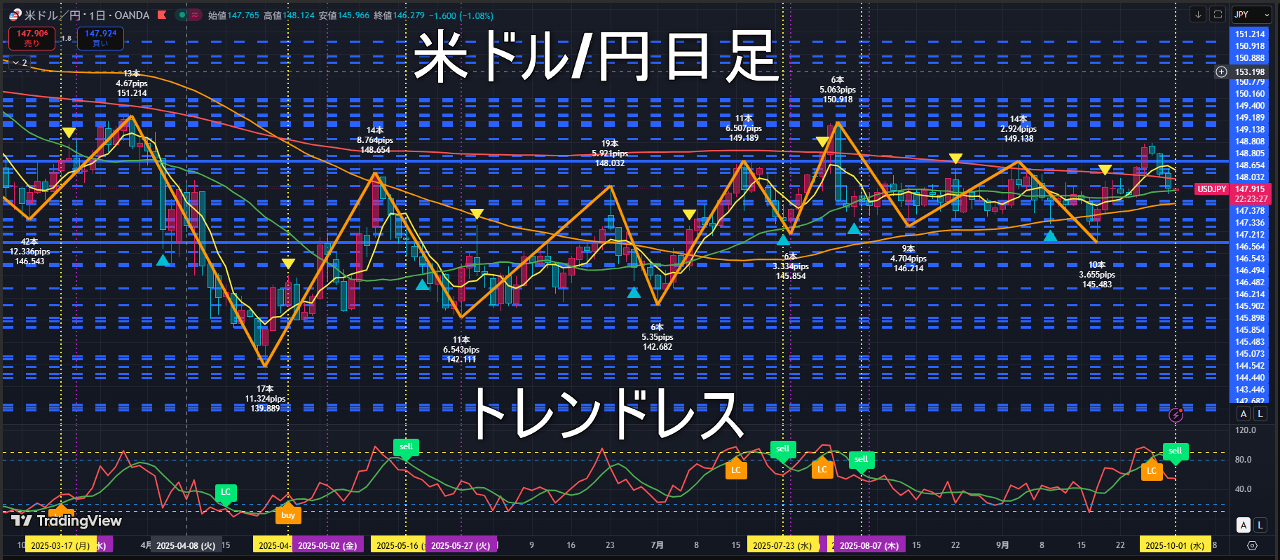 直近ボトム147.463円を下回るとトレンドレスに転換。